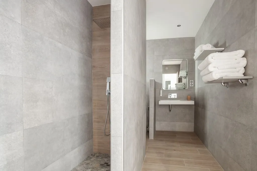 - Revêtements de sol et murs : faïence, béton ciré, parquet, carrelage grand format, pierre naturelle